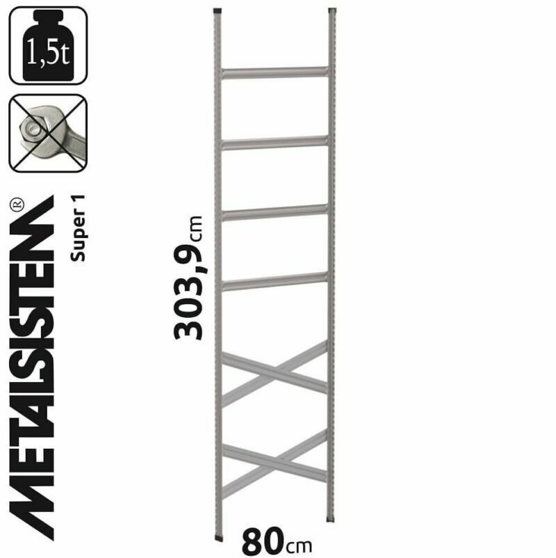 METALSISTEM (Italija), Super 1 serijos stelažų stovai sudaryti iš dviejų cinkuoto plieno kojų, tarpusavyje sujungtų skersiniais bei diagonalėmis, juodo plastiko padukai bei kojų viršutinės dalies apsaugos. Sandėlyje įprastai turime 1,2 – 3m aukščio, 0,32 – 0,8m gylio, 1500kg apkrovai pritaikytus stovus. Prireikus, galėsime pasiūlyti ir dar aukštesnius, didesnėms apkrovoms pritaikytus stovus. Stovus galima sutrumpinti iki reikiamo aukščio. Lentynos kabinamos iš abiejų stovo pusių. Jų aukščio keitimo žingsnis – tik 33mm! Jei stovus reikalinga tvirtinti prie pagrindo, ar naudoti išlyginimo plokšteles, stovai gali būti komplektuojami su metaliniais padukais. Stovus galima sutankinti montuojant papildomas horizontales, arba montuoti uždarus, bei perforuotus galų uždengimus. Labai patogūs yra tiesiog ant stovo horizontalių kabinami, 13 – 40l talpos plastikiniai konteineriai. Juos galima naudoti tiek kaip šiukšlių dėžes, tiek ir kaip talpyklas įvairiems daiktams sudėti.